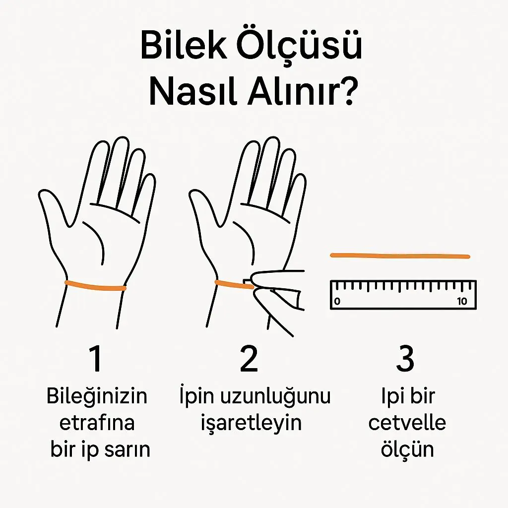 Bileklik ölçüsü almak için bileğinizin çevresini bir mezura veya ip yardımıyla ölçebilirsiniz. Bileğinizi sıkmadan ve pay bırakmadan tam ölçüsünü alın.